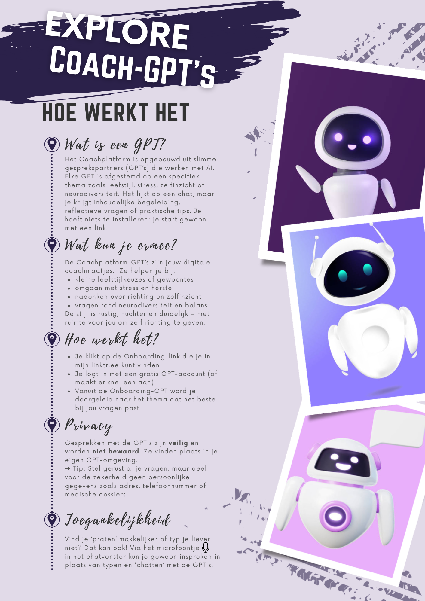 Soms is het fijn om even met iemand te sparren, zonder dat er meteen iets van je verwacht wordt. Daarom heb ik een paar digitale hulpjes ontwikkeld: slimme chatbots die je op een laagdrempelige manier ondersteunen. Je kunt er altijd terecht met vragen over leefstijl, stress, balans of richting in je leven. Ze stellen vragen die je aan het denken zetten, geven tips en reiken ideeën aan die je meteen kunt gebruiken. Zie ze als extra sparringpartners die je in alle rust mag uitproberen, gratis en vrijblijvend, in je eigen tempo, op een moment dat het jou goed uitkomt.