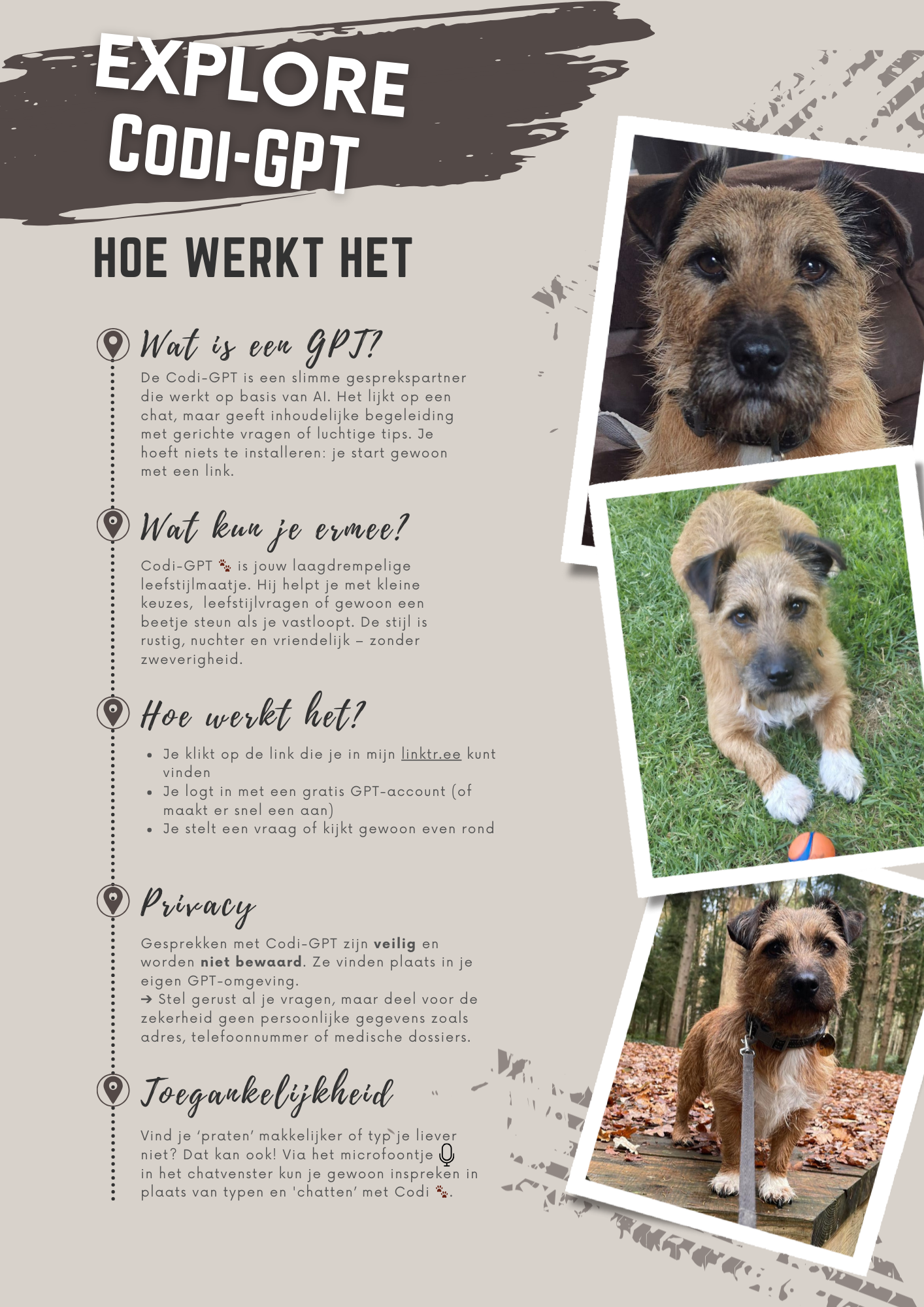 Ik ben Codi. Wat ik doe? Nou… ik lag net heerlijk languit in mijn zonplekje, beetje te dromen over renpaadjes en rondslingerende stokken. Maar als jij roept, ben ik er natuurlijk meteen bij. Staart omhoog, oren gespitst!